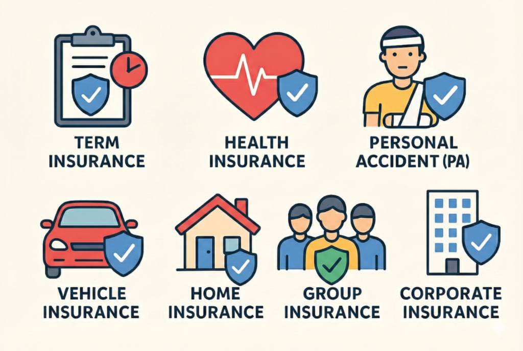Insurance is a financial protection tool that helps individuals and families manage risks related to life, health, assets, and income. By paying a small amount called premium, you get financial support during emergencies or unforeseen events.